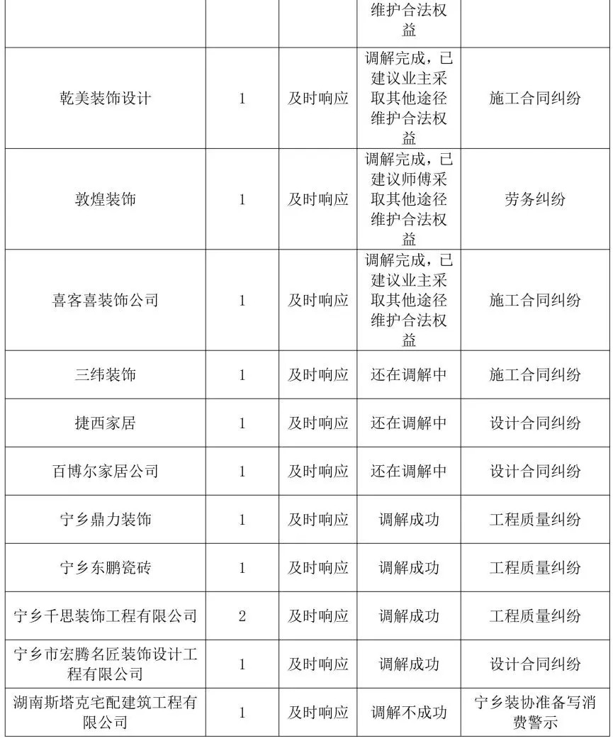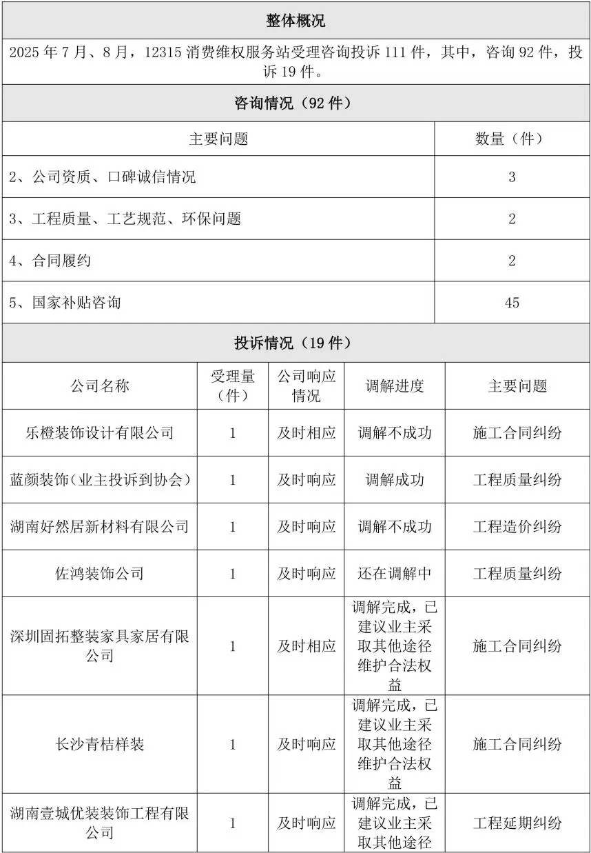 協會是湖南省消保委批準的消費教育基地、長沙市消保委設立的投訴站、長沙市司法局設立的長沙市建筑裝飾裝修行業人民調解委員會,按照工作要求負責受理、協調處理全市范圍內的家居裝飾裝修消費領域維權投訴,并根據《市場監督管理投訴信息公示暫行規則》及長沙縣裝協和寧鄉裝協反饋意見,綜合其數據,現將2025年7月份、8月份投訴信息公示如下: