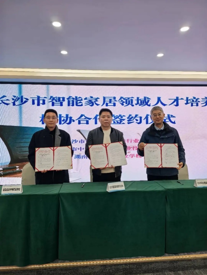 在與會(huì)嘉賓的共同見(jiàn)證下,儀式進(jìn)入了核心環(huán)節(jié)。長(zhǎng)沙市建筑裝飾裝修行業(yè)協(xié)會(huì)會(huì)長(zhǎng)康強(qiáng)新、長(zhǎng)沙市中等城鄉(xiāng)建設(shè)職業(yè)技術(shù)學(xué)校校長(zhǎng)劉廣宇、湖南建設(shè)中等職業(yè)學(xué)校校長(zhǎng)潘瑞旺分別代表三方,共同簽署了《長(zhǎng)沙市智能家居領(lǐng)域人才培養(yǎng)校協(xié)合作協(xié)議》。協(xié)議的簽署,意味著一個(gè)整合了“行業(yè)資源、場(chǎng)地資源與教育資源”的協(xié)同育人平臺(tái)正式建立。